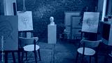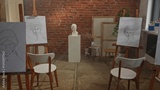 Shot of modern art class room, canvas with female pencil sketch portraits stand on easels and antique woman head model statue.