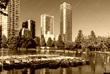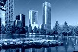 Boats at the dock of Shinobazu Pond in Ueno Park in Tokyo reflecting on the water with modern high rise buildings in the background