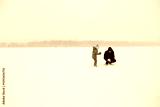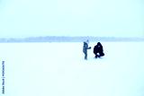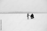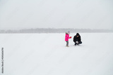 Father with daughter dressed warmly and in warm gloves builds a snowman in a snowy near the lake.