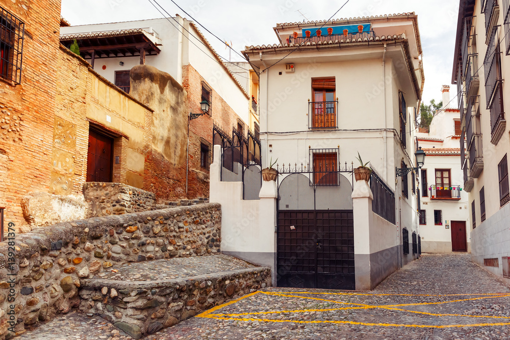 Scenic alley with traditional Spanish white houses in the old town area of Albaicin, Granada, Andalusia, Spain