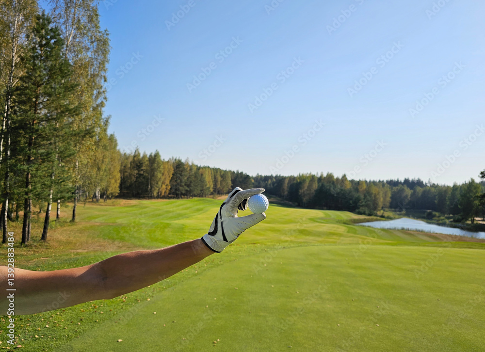 Golfer prepares to drive the ball on a sunny day at a picturesque golf course concept