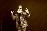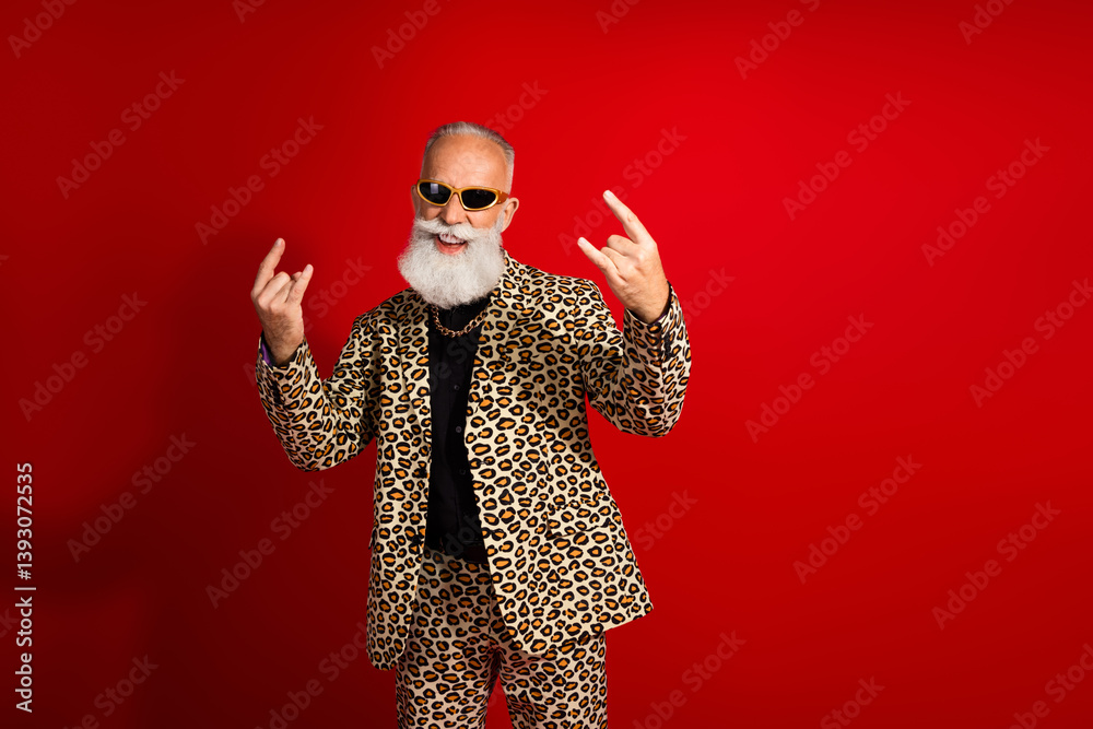 Fashion model man in leopard print suit with iconic gestures on vibrant red background exuding style and confident energy