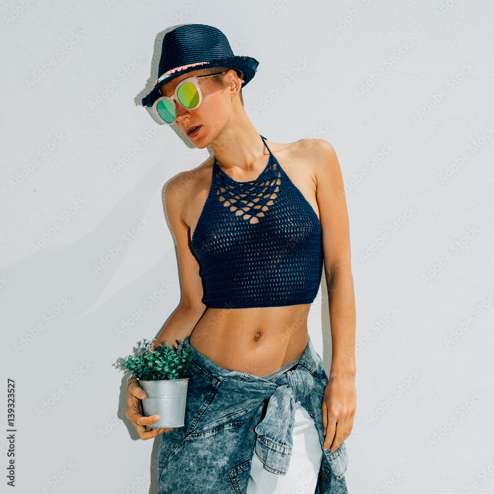 I Love My Summer. Stylish Boho Outfit. Hipster model. Denim and straw hat. Relax Accessories