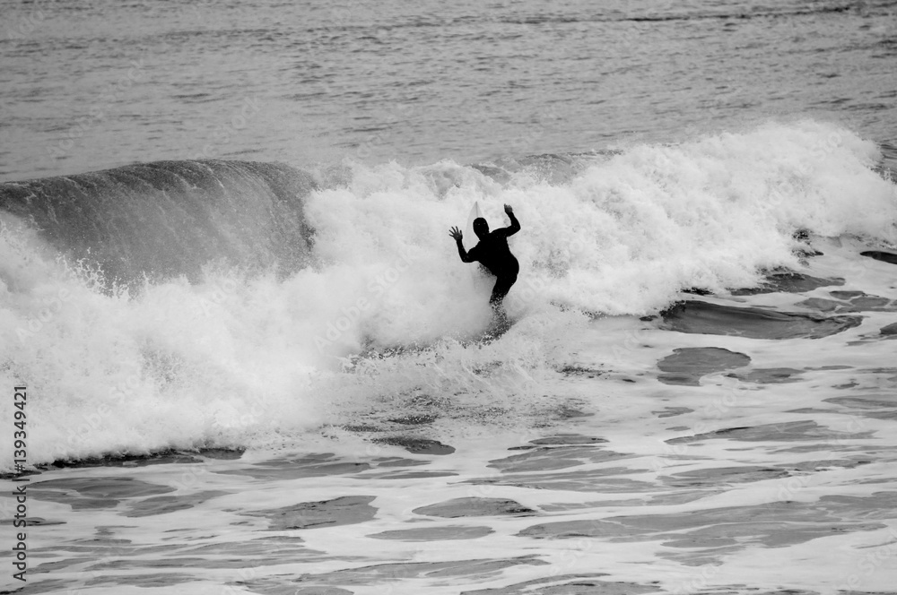 A surfer riding top of a wave at San Francisco's Fort Point, San Francisco Bay, California, USA
