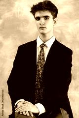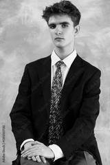 Formal portrait of a young man in a dark suit, white shirt, and patterned blue tie against a grey textured background with hands clasped