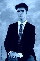 Black and white portrait of a young man in formal attire, featuring a suit jacket, tie, and collared shirt against a textured backdrop. He is looking directly at the camera with hands clasped