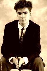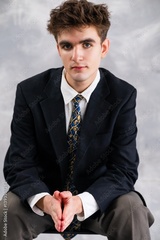 Formal portrait of a young man with short brown hair, wearing a dark suit, white shirt and patterned tie against a gray backdrop. He sits calmly looking at the camera
