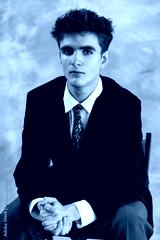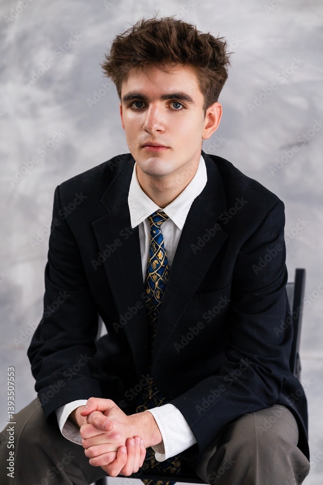 Formal portrait of a young man with dark hair, wearing a suit and tie against a textured gray backdrop looking directly at the camera