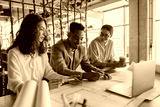 Three skilled professionals actively engaging in a collaborative and productive discussion in a bright office setting