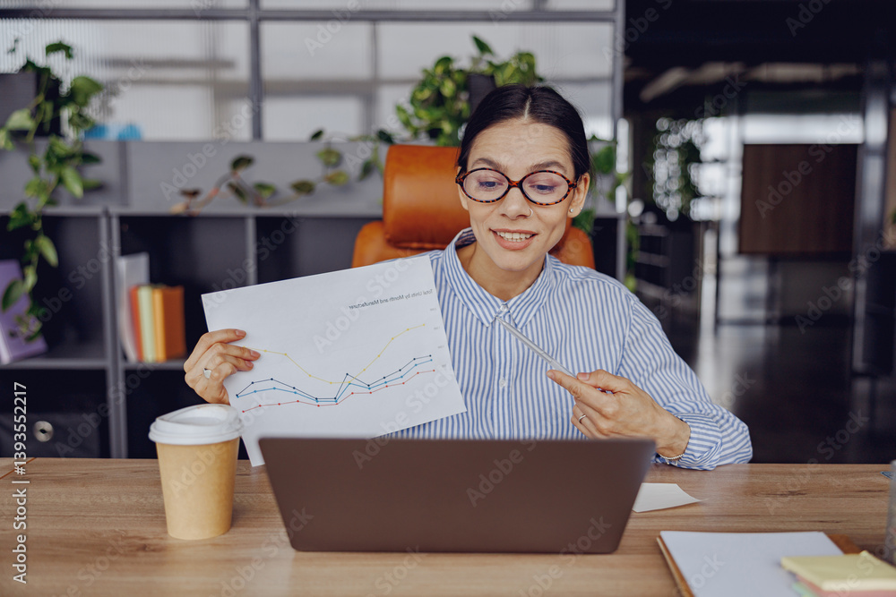 A skilled professional woman actively showcases a variety of data analysis charts in her stylish modern workspace