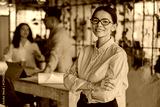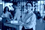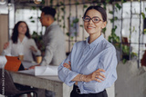A confident businesswoman smiling brightly in a modern office while her colleagues engage in an animated discussion