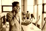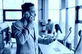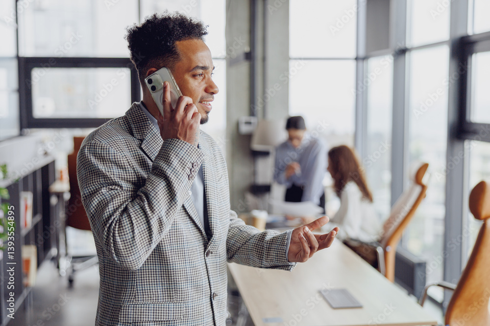A successful businessman in a modern office discusses important matters on the phone, highlighting workspace design