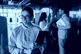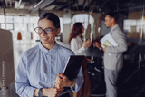A professional woman smiles confidently while surrounded by her supportive colleagues in a modern office setting