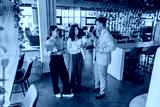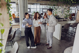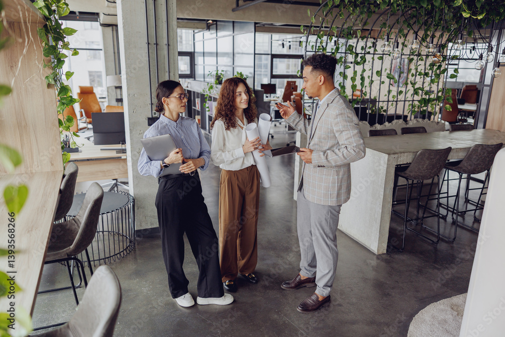In a modern office, three professionals engage in meaningful conversations and collaborate actively