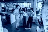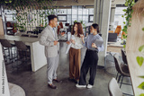 A diverse group discusses ideas in a stylish office with greenery, highlighting teamwork and creativity.