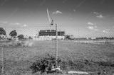 A chain-link barrier fences off a vacant, undeveloped plot next to a construction site for an apartment or office building, showing suburban real estate growth in Melbourne, Australia.