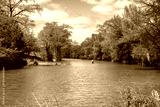 Man fishing in a river lined with bald cypress trees all in spring green under cloudy sky, Guadalupe River, Hill Country, Texas