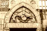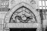 Angels carved in stone above the entrance of a cathedral.