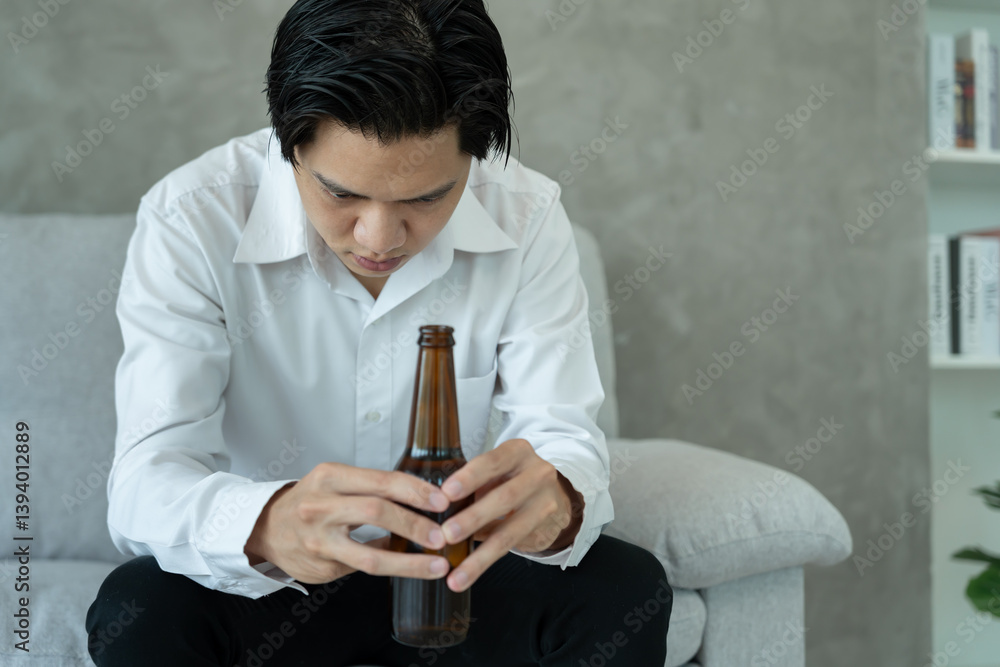 Depressed young business man addicted feeling bad drinking whiskey alone at home, stressed frustrated lonely drinking alcohol suffers from problematic liquor, alcoholism, life and family problems