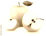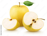 Ripe yellow apple fruit green leaf, slice and half with slices isolated on white background