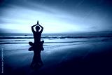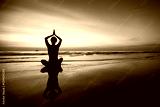 Woman doing meditation near the ocean beach. Black and white silhouette.