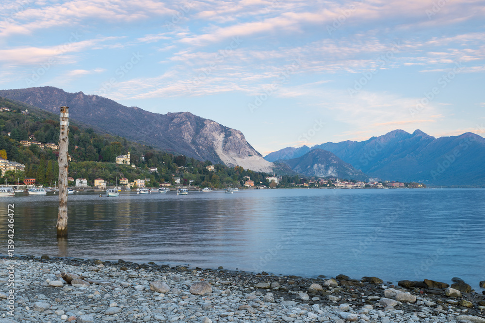 Stresa and lake Maggiore at sunrise, Italy. Panorama from the lakefront of the town of Stresa towards Baveno, in the distance. Large lake in northern Italy