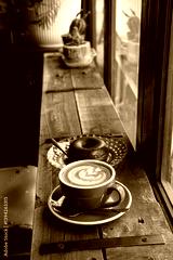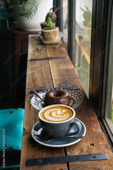 Hot coffee latte with latte art milk foam in cup mug and Homemade chocolate Donut on wood desk on top view. As breakfast In a coffee shop at the cafe,during business work concept,vintage style