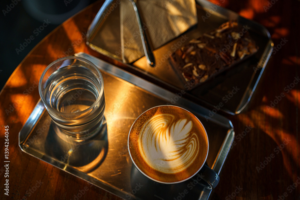 Hot coffee latte with latte art milk foam in cup mug and Homemade Brownie on wood desk on top view. As breakfast In a coffee shop at the cafe,during business work concept,vintage style