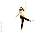 Full length body size photo of cheerful charming cute nice attractive fascinating girl wearing jeans denim dancing rejoicing screaming isolated over teal vibrant color background