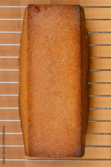 A freshly baked lemon cake rests on a wire cooling rack over a wooden surface
