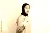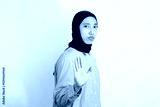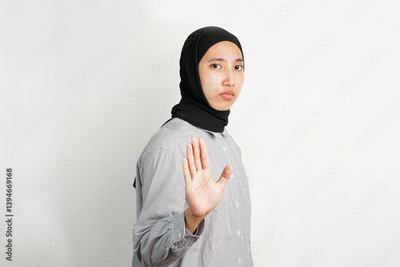 Young Asian woman raising her hand with palm facing forward in a stop gesture, expressing refusal or warning with a serious expression while standing against a plain background.