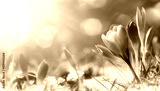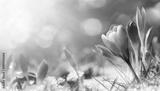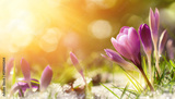 Krokus Blümchen im Schnee begrüßen die warme Sonne