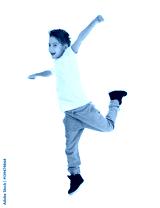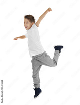 Cute funny boy dancing on white background