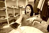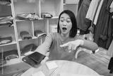 Excited young woman in a clothing store interacts with her smartphone while completing her tasks