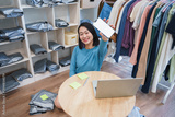 Young woman managing online store in workspace filled with packages and clothing while using smartphone on wooden table