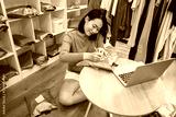 Woman prepares packages for shipment in a clothing store while managing online orders at a desk