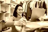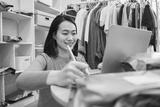 Young woman working on a laptop in a clothing store, organizing packages and inventory