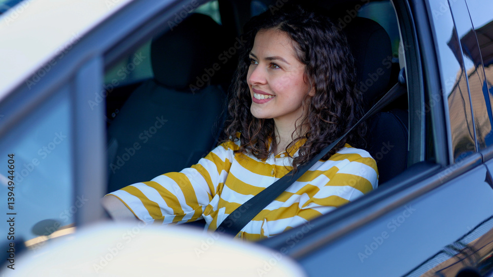 Young woman driving a car and smiling at the road ahead, enjoying her journey