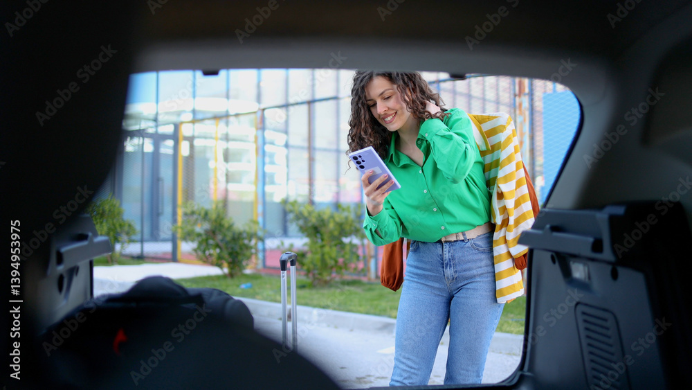 Woman loading suitcase into car trunk, checking smartphone before departing on travel journey