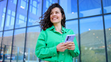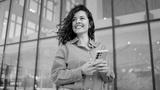 Professional woman smiling, gripping smartphone near contemporary corporate exterior