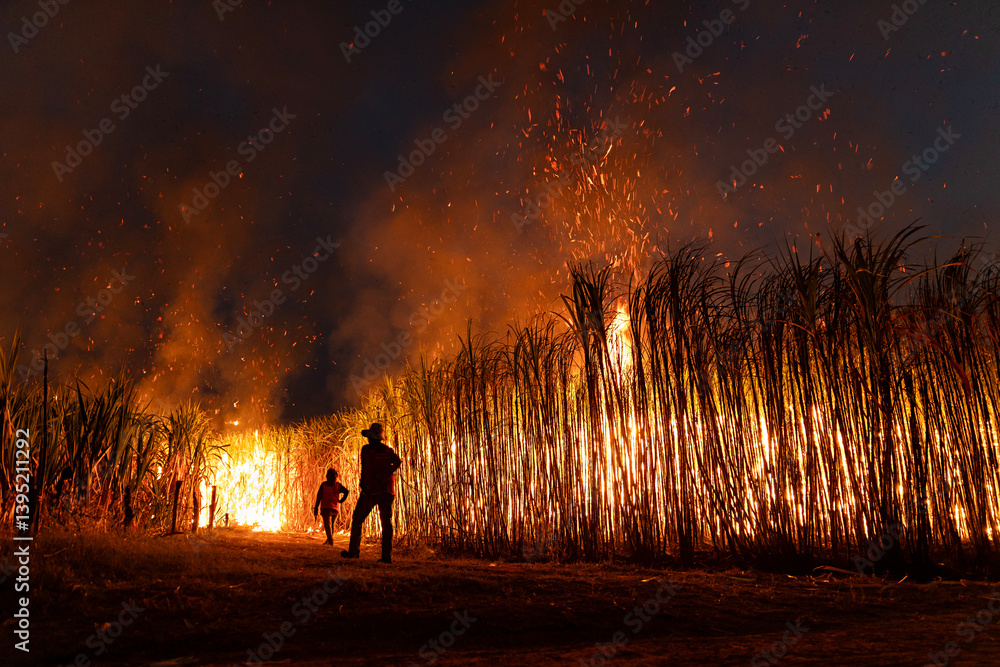 Asian worker burning sugarcane field at night to harvest and send to factories, leads to global warming and climate change, environment concept.