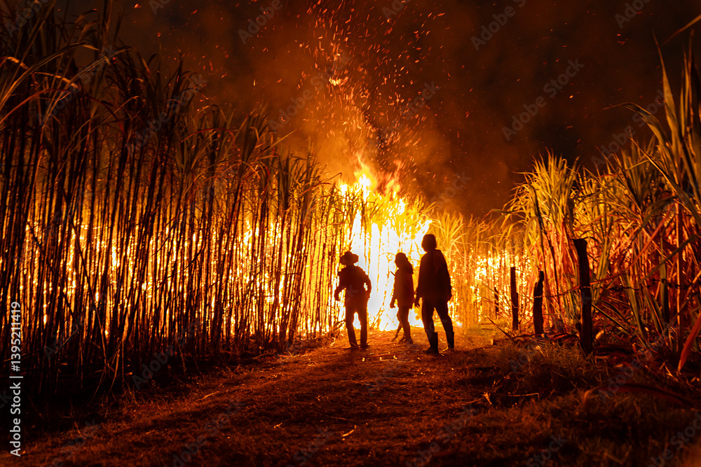 Silhouette, sugarcane burned by farmer at night for pre-harvest, global warming and climate change, environment concept, in Thailand.