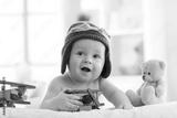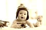 Laughing little baby weared pilot hat with airplane and teddy bear toys