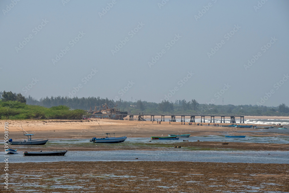 małe niebieskie łódki na mieliźnie podczas odpływu oceanu