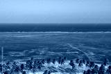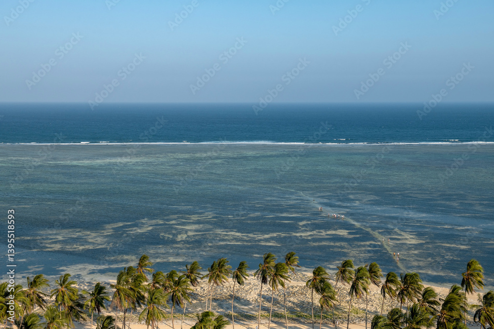 laguna z plażą porośnięta palmami i rafą koralową na horyzoncie