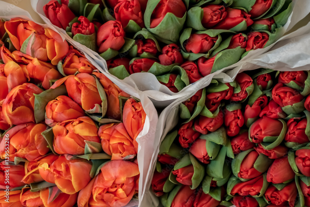Bright red and orange tulips bunches