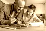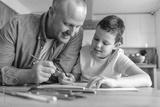 Caucasian boy doing homework with his dad. A handsome young man helping his son with school work at home. It's important to learn and get an education. A parent and child working on a project.