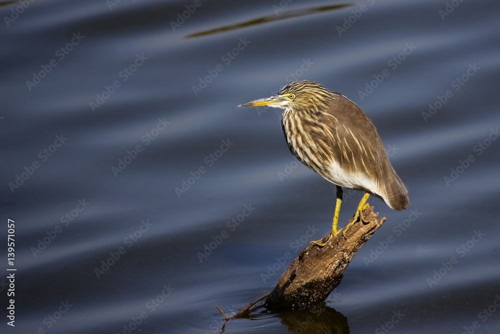 Indian Pond heron sitting on a branch in the water, Ranthambore National Park, India