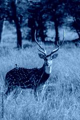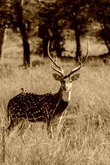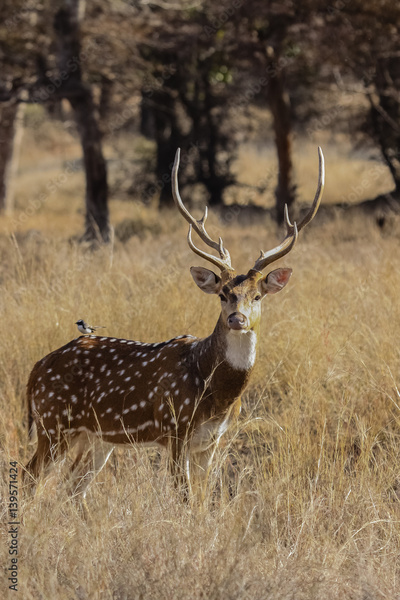 Male Spotted deer, facing, in brown grass, Ranthambore National Park, India