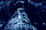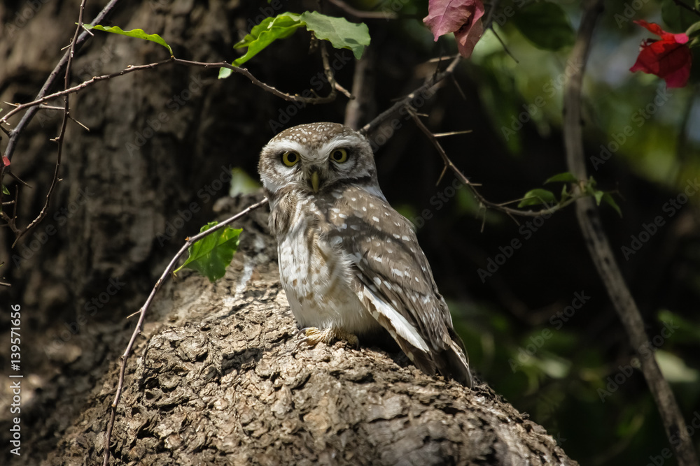 Spotted owlet perching on a tree trunk, facing, Ranthambore National Park, India